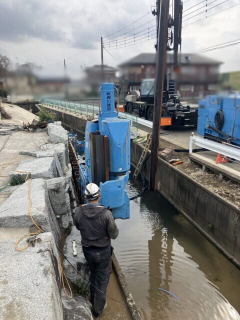 既設水路の転倒防止の土留め工。一部民家に近接する箇所をゼロクリアランス工法で施工。