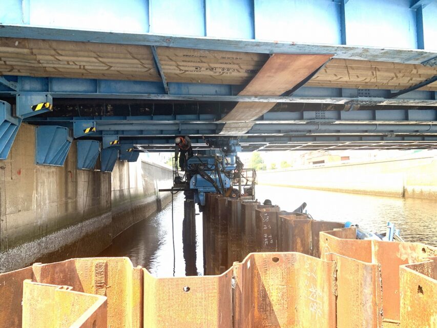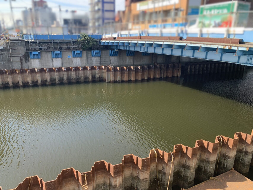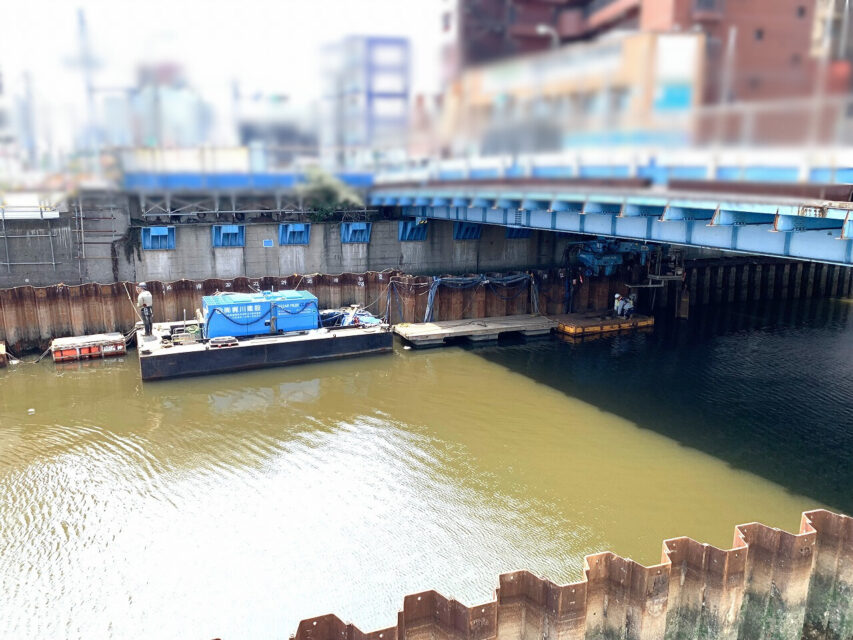 - 既存橋梁下部工事のための仮締切工。上部障害クリア工法による土留鋼矢板圧入。 騒音及び振動に対して近隣住宅に配慮した工法として採用。 航路確保のため、台船配置に憂慮して施工を行った。