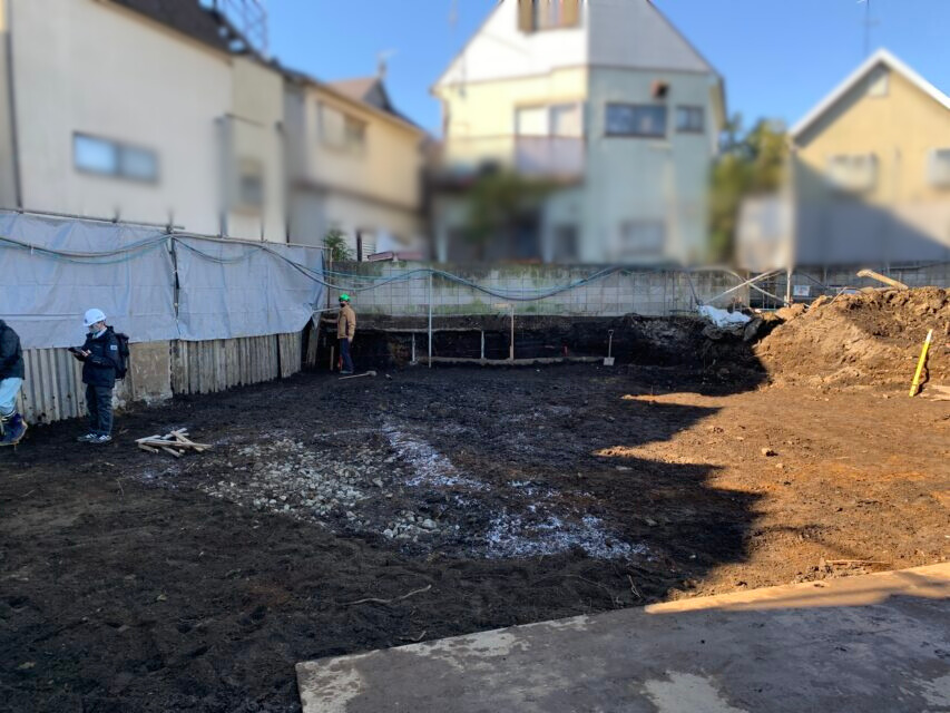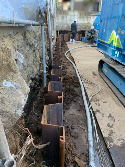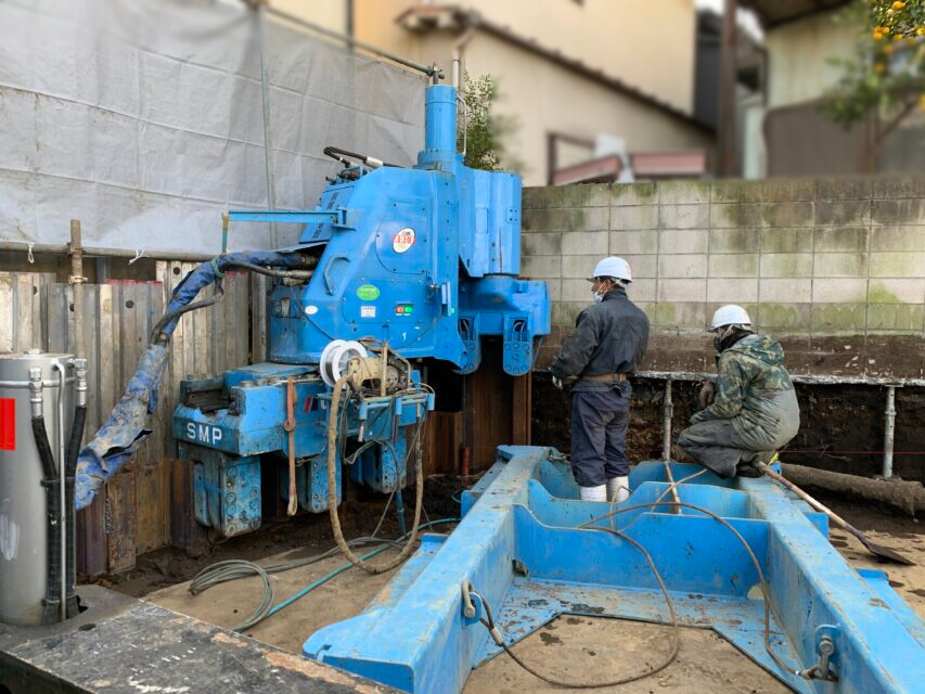 既設建造物の解体。土壌汚染対策のための土留め壁施工。 初期反力圧入をゼロ施工にて行い、民家近接離隔5cmでのゼロ矢板圧入を行った。 隣地民家の接近施工でも振動・騒音が少なく、低公害での施工が可能。