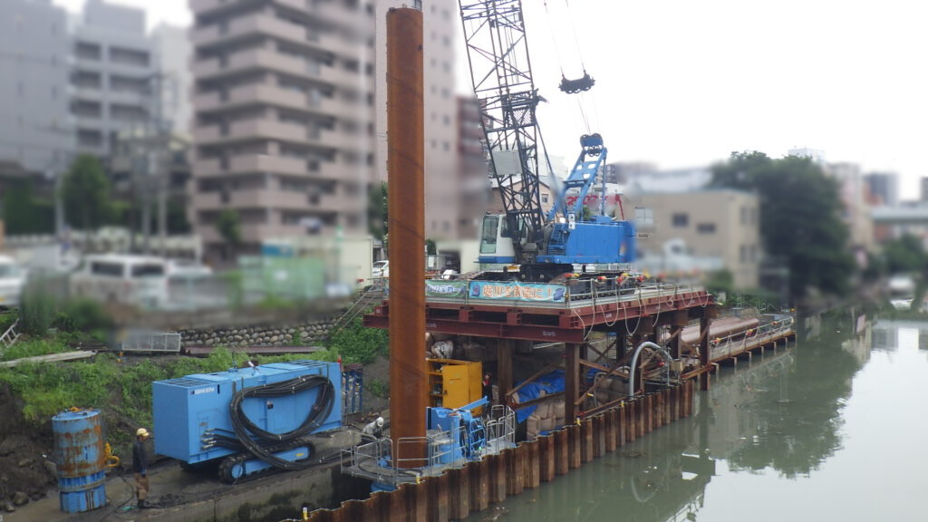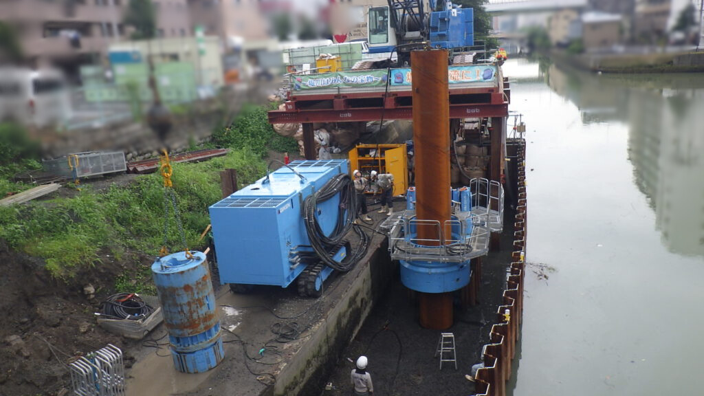 - ジャイロプレス工法での施工により、護岸への影響を最小限に抑えることができた。 河川周辺の住宅、施設への影響を与えることなく完了。 堤防護岸老朽化に伴う補強のための工事。